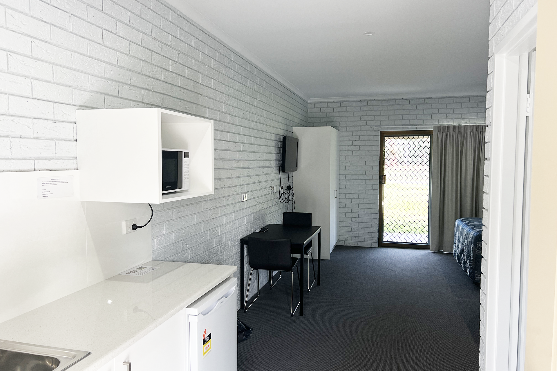 Split system heating/air con in each room, supplied linen (incl. towels), wardrobes, TV, kitchenette with coffee/tea making, and microwave offer you every convenience. Free WiFi and LED TVs (free-to-air only) with digital inputs are standard. Our beds are true comfort, and we’ve just introduced room cleaning for all stays longer than 3 nights upon request.
